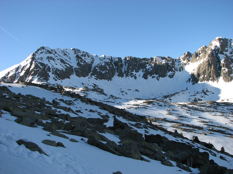 La continuación de la ruta es evidente. Seguir al N-NO para acabar de cruzar la zona poco inclinada en que nos encontramos. Después subir en diagonal por un terreno que va ganado inclinación. Mas arriba habremos de esquivar, primero por debajo y despues por la derecha, un espolón rocoso que emerge de la nieve. Tras el mismo deberemos alcanzar una canal muy evidente que alcanza a la brecha que separa las cumbre del pico de Comalesbienes y de la Punta Alta. Son uno 200 metros de desnivel que en verano haríamos en unos tres cuartos de hora. Hoy podemos tardar dos horas, tal vez mas...